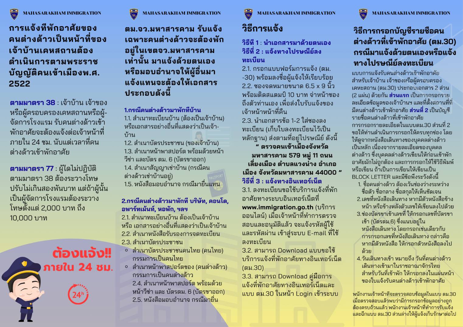 ในห้วงที่รัฐบาลมีนโยบายรับนักท่องเที่ยวต่างชาติเพื่อฟื้นฟูเศรษฐกิจ ผู้บังคับบัญชา สำนักงานตรวจคนเข้าเมือง สั่งการให้ ตม.ทุกจังหวัด เร่ง X-Ray พื้นที่จัดระเบียบคนต่างด้าว เพื่อป้องกันอาชญากรรม และต้องไม่กระทำผิดกฎหมาย ตม.จว.มหาสารคาม ขอประชาสัมพันธ์ไปยังเจ้าบ้าน ผู้ประกอบการโรงแรม อพาร์ทเม้นท์ หอพัก บ้านให้เช่า เมื่อรับคนต่างด้าวเข้าพักอาศัย ให้แจ้งการ เข้าพักอาศัยของคนต่างด้าว หรือการจะรับแรงงานต่างด้าวเข้าทำงาน ให้ดำเนินการให้ถูกต้องตามกฎหมาย หรือหากพบเบาะแสพฤติการณ์ที่ไม่พึงประสงค์ของคนต่างด้าว หรือสงสัย หรือพบคนต่างด้าวที่ต้องการความช่วยเหลือใด สอบถามขอคำแนะนำได้ที่ ตม.จว.มหาสารคาม โทรศัพท์หมายเลข 043-750621 และ 043-971278 เพื่อความสงบสุข และภาพลักษณ์ที่ดีของจังหวัดมหาสารคาม และขอขอบคุณชาวจังหวัดมหาสารคาม ที่เป็นเบาะแสให้กับเจ้าหน้าที่