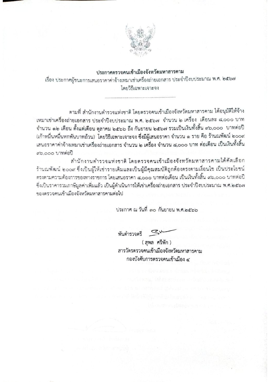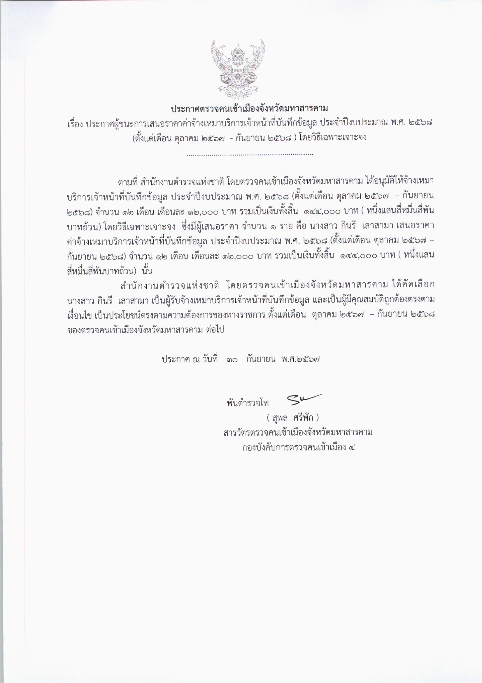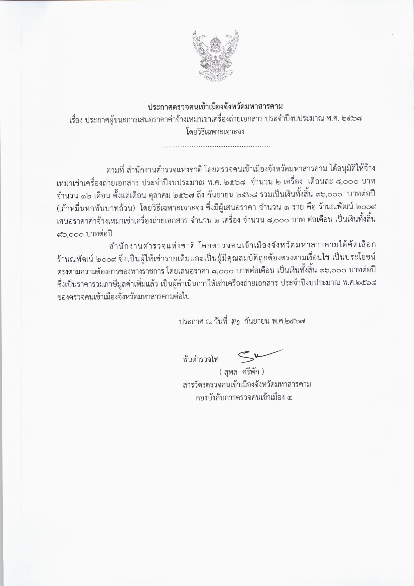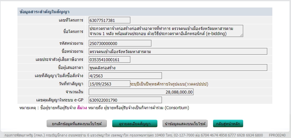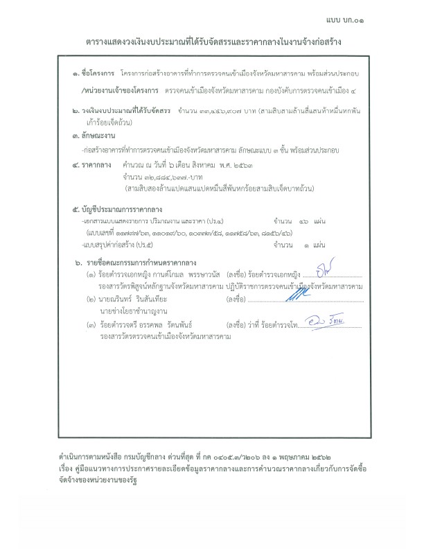 - ประกาศเผยแพร่สาระสำคัญของสัญญาจ้างก่อสร้างอาคารที่ทำการตม.จว.มหาสารคาม