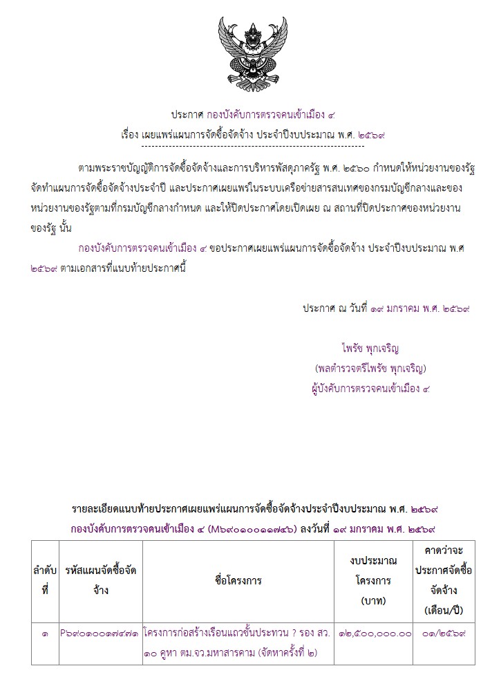 ประกาศแผนจัดซื้อจัดจ้าง 2569 (โครงการก่อสร้างอาคารเรือนแถวชั้นประทวน-รอง สว. 10 คูหา)