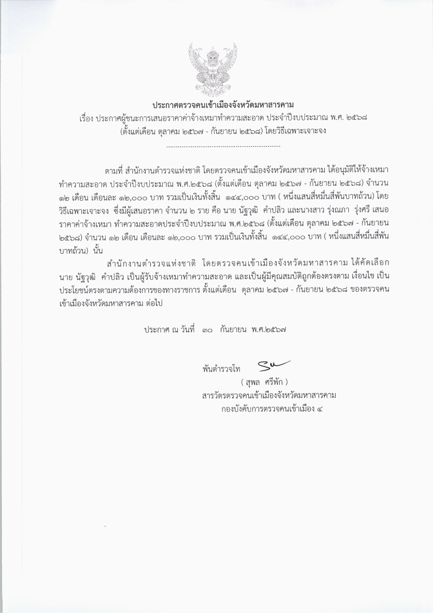 - ประกาศผู้ชนะการเสนอราคาค่าจ้างเหมาทำความสะอาด ประจำปีงบประมาณ พ.ศ.2568 โดยวิธีเฉพาะเจาะจง ราย นัฐวุฒิ คำปลิว