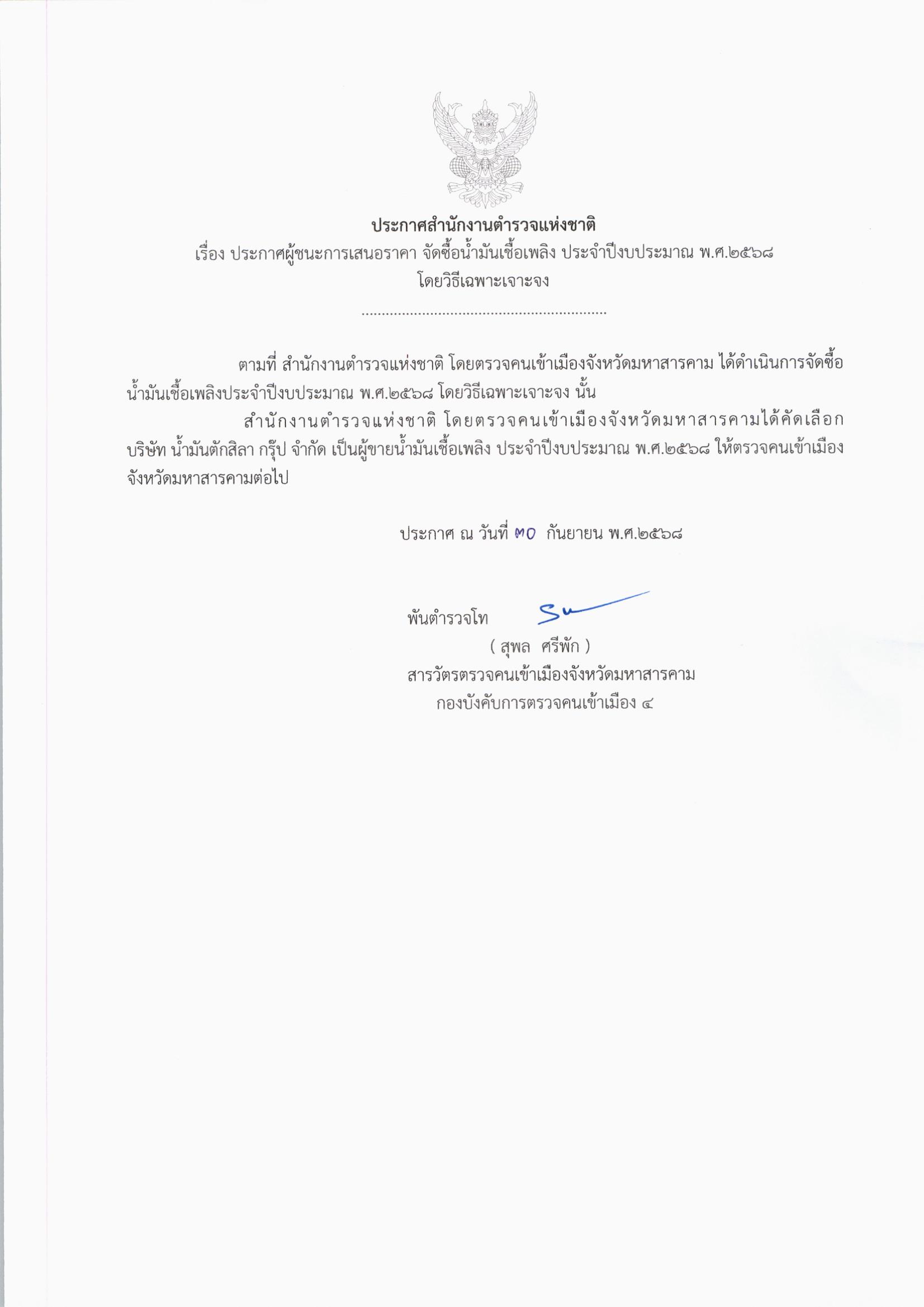 - ประกาศผู้ชนะการเสนอราคา จัดซื้อน้ำมันเชื้อเพลิง ประจำปีงบประมาณ พ.ศ.2568 โดยวิธีเฉพาะเจาะจง