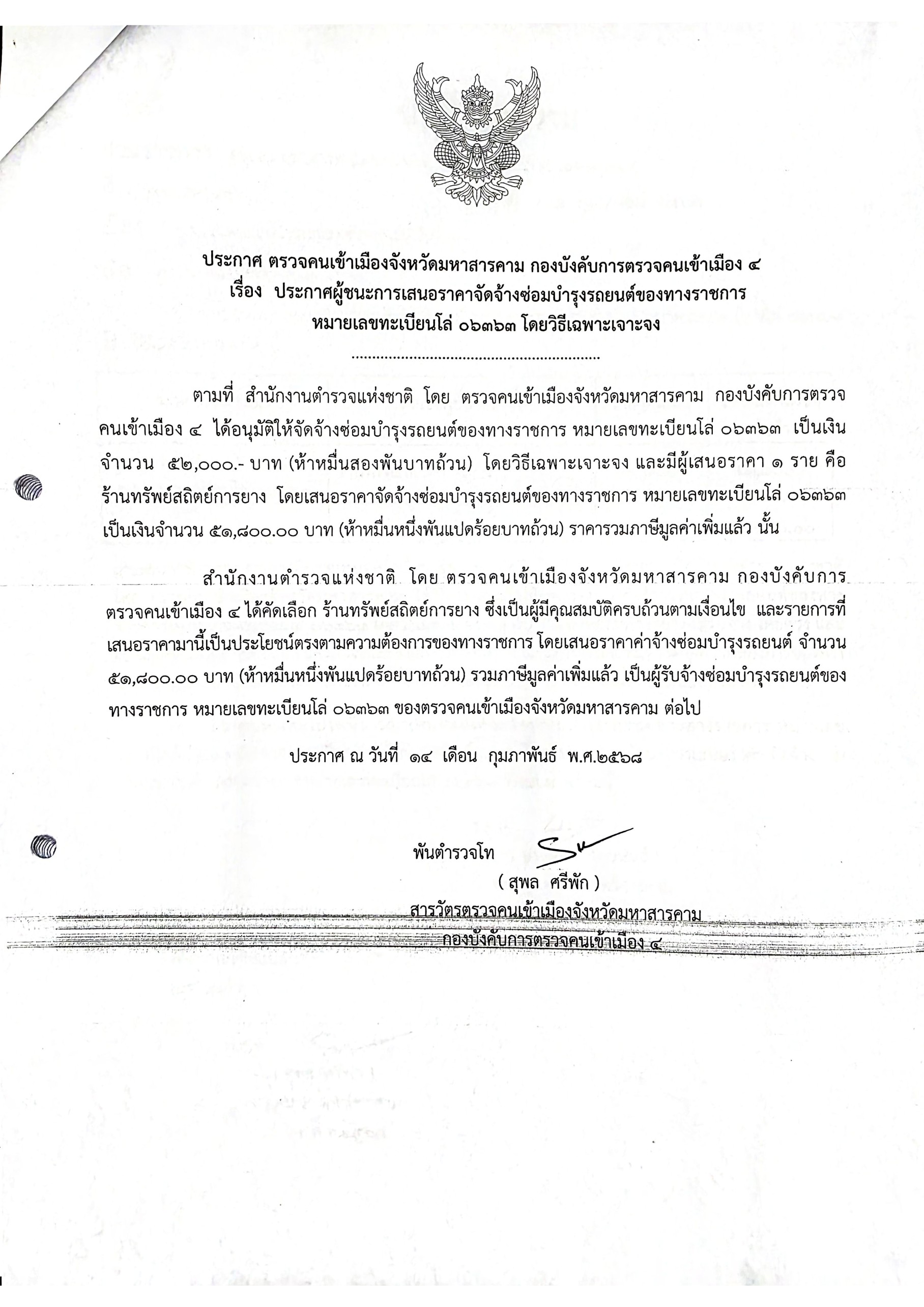 - ประกาศผู้ชนะเสนอราคาจ้างซ่อมบำรุงรถยนต์ตรวจการณ์ของทางราชการ