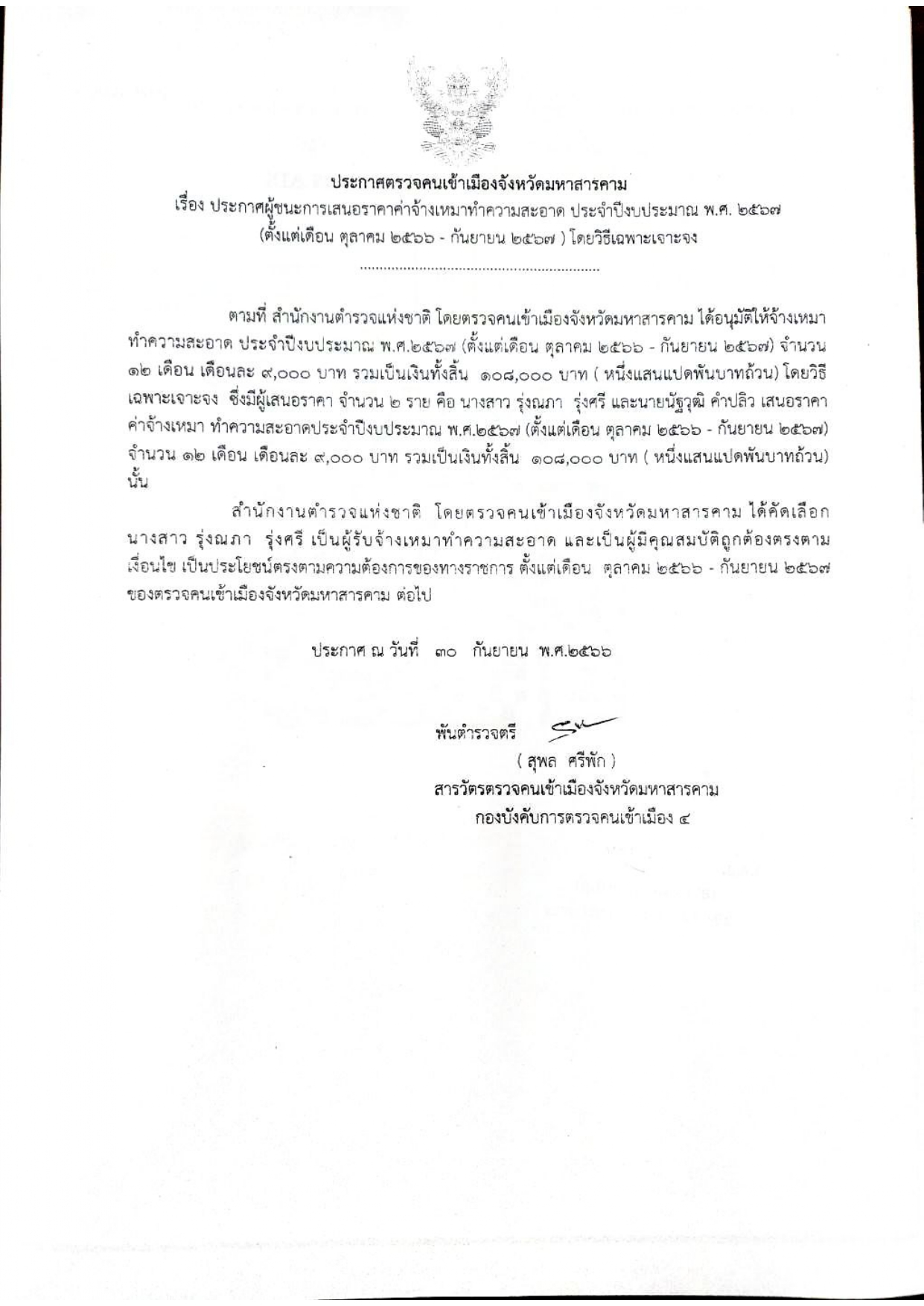 - ประกาศผู้ชนะการเสนอราคาค่าจ้างเหมาทำความสะอาด ประจำปีงบประมาณ พ.ศ.2567 โดยวิธีเฉพาะเจาะจง ราย นัฐวุฒิ คำปลิว