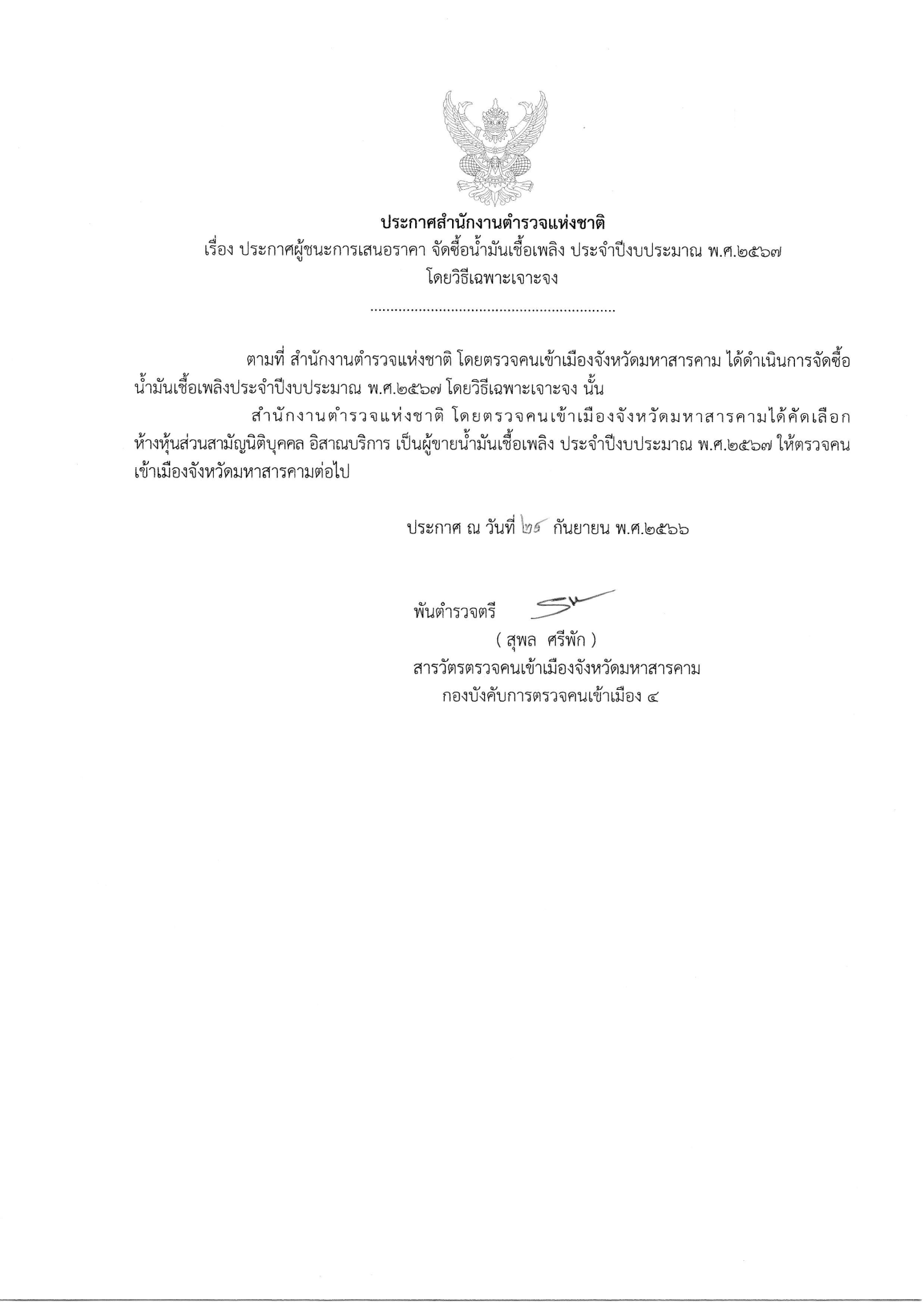 - ประกาศผู้ชนะการเสนอราคา จัดซื้อน้ำมันเชื้อเพลิง ประจำปีงบประมาณ พ.ศ.2567 โดยวิธีเฉพาะเจาะจง